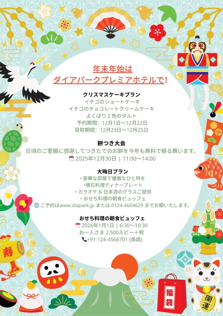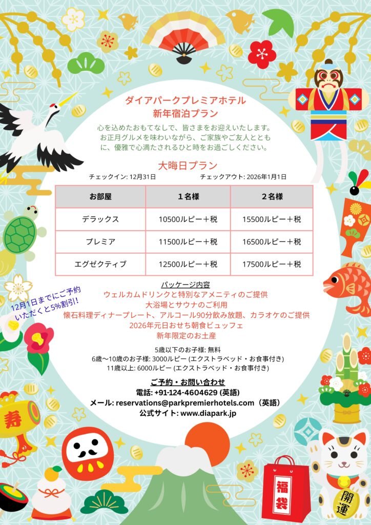 チェックイン チェックアウト 大人 1名 2名 3名 4名 子供 0名 1名 2名 3名 部屋数 1室 2室 3室 4室 空室状況を確認 グルガオンの中心にある日本の心地よい安らぎの空間 Dia Park Premier は、グルガオンの中心部「ミレニアムシティ」に位置するプレミアム・ビジネスクラスホテルです。ニューデリー国際空港から車でわずか20分という便利なロケーションにあります。現代的なインドのおもてなしと、日本のデザインが持つ優雅さと静けさを融合させ、世界各国から訪れるお客様、特に日本からのお客様に心から安らげる滞在をご提供いたします。 インドで味わう、本格的な日本のおもてなし。 Dia Park Premier では、遠く離れた場所にいても「まるで我が家のようにくつろげる」ことの大切さを深く理解しています。その想いから、私たちは日本の伝統、快適さ、そして温もりを大切にした特別な体験をご用意いたしました。ビジネスでも観光でも、インドを訪れる日本のお客様に心から安らげるひとときをお届けいたします。 本格日本料理レストラン 熟練した料理人が心を込めて仕上げる、伝統的な日本料理をご堪能ください。日本料理レストランでは、和朝食ブッフェから本格的なおまかせコースまで、どのお料理も日本の味わいと温もりをお届けいたします。 大浴場〈お風呂・Ofuro〉 男女別の日本式大浴場で、心と身体をゆっくりと癒やし、活力を取り戻してください。静寂に包まれたこの空間は、安らぎ・心の整え・新たな活力のために設計された特別なリトリートです。 日本人コンシェルジュ チェックインからチェックアウトまで、快適で心地よく、そしてお客様一人ひとりに寄り添った滞在をお楽しみいただけるよう、日本語対応のコンシェルジュを含む専任チームがきめ細やかにサポートいたします。 ウェルネス&スパ 心と身体の調和を取り戻す、極上のリラクゼーションを。日本のホリスティックセラピーや伝統的なトリートメントを取り入れたフルサービススパで、深い癒やしと活力を体感してください。 館内の様子